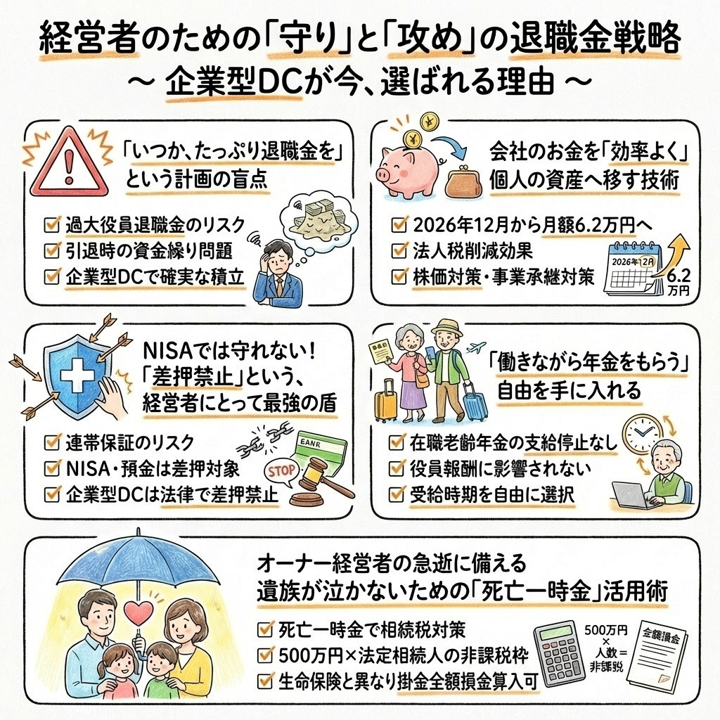 「税務リスクの回避」「効率的な資産移転」「最強の資産保全」「受給の自由度」「相続対策」という、経営者自身が抱える切実な悩みを一気に解決できる、合理的な経営戦略です。