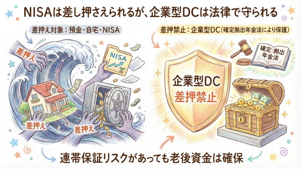 企業型DCは、確定拠出年金法という法律によって「差し押さえが禁止」されているからです。これは「年金」という老後の生活を守るための特別な制度だからこそ認められている特権です。