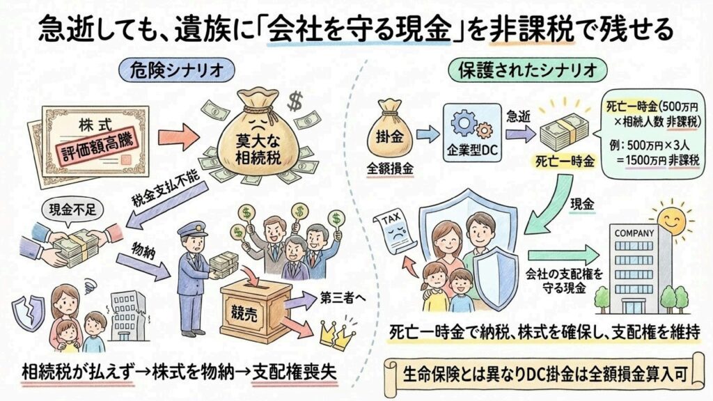 これは生命保険の死亡保険金と同じ発想ですが、大きな違いはコストです。生命保険料は全額を経費にできないことが多いのですが、企業型DCの掛金は「全額が法人の経費(損金)」になります。