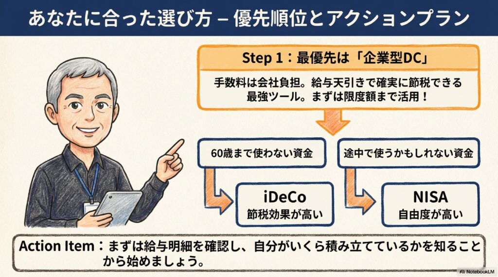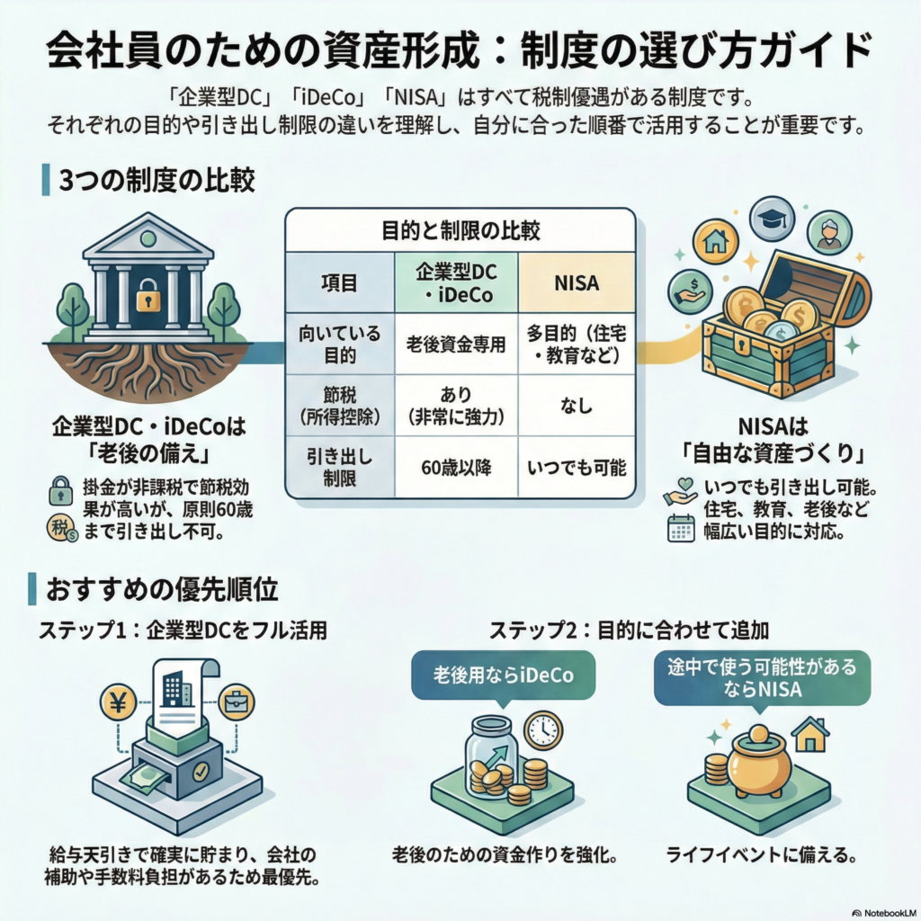 会社員の方は、まず給与天引きで節税効果が高い「企業型DC」を最優先で活用しましょう。その上で、60歳まで使わない老後資金は「iDeCo」、住宅や教育など途中で使う可能性のある資金は「NISA」と使い分けるのが鉄則です。