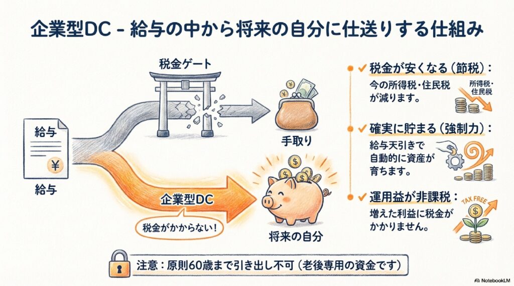 「企業型DC」は、会社にお勤めの皆さんにとって最も身近で、かつ強力な制度です。簡単に言えば、「毎月の給料の中から、将来の自分へ仕送りをする仕組み」です。